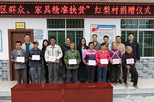 本次活动得到了省民政厅社会组织管理局、始兴县委县政府、马市镇委镇政府有关领导的亲切关怀,也得到了省机构编制委员会办公室驻红梨村定点帮扶工作队及村委会的高度重视。省民政厅社会组织管理局党群工作处副处长徐志军、副科长朱琳,省十三届人大代表、省社会组织党委委员、省家协党支部书记/会长王克,省编办驻村工作队队长兼第一书记曾庆辉,始兴县委组织部副部长黄乐,始兴县扶贫办主任何丹,马市镇组织委员肖卫,红梨村村委会党总支书记兼主任傅联海等领导出席。省家协常务理事单位、顺德研发院党支部书记张建新,理事单位、东莞市菩提树家具厂分厂总经理梁耀文,副会长单位、穗宝家具集团党总支书记李润章等捐赠单位负责同志,以及佛山维尚家具公司党总支书记曾丹、广东中泰家具公司党支部书记黄春晓、乐从家具协会党支部优秀党员邓凯军等广东省家具行业党组织活动阵地规范化建设示范点的负责同志参加了捐赠仪式。 仪式由曾庆辉书记主持,曾书记首先代表红梨村全体村民欢迎大家的到来,感恩大家的关怀和善举,为参与扶贫活动的每一位代表授予“红梨村荣誉村民”的称号。