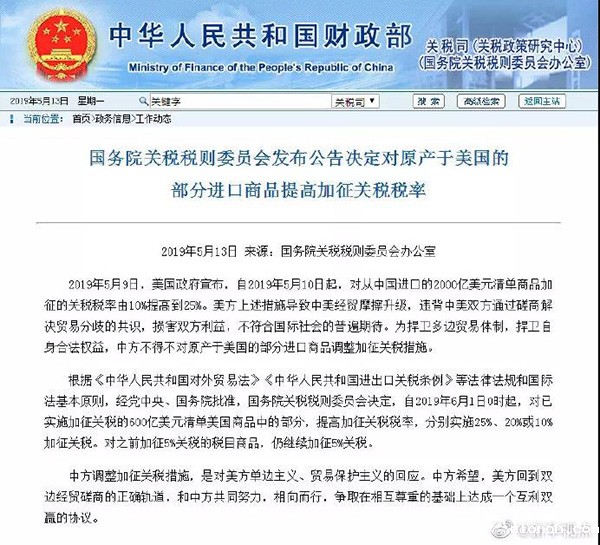 根据《中华人民共和国对外贸易法》《中华人民共和国进出口关税条例》等法律法规和国际法基本原则,经党中央、国务院批准,国务院关税税则委员会决定,自2019年6月1日0时起,对已实施加征关税的600亿美元清单美国商品中的部分,提高加征关税税率,分别实施25%、20%或10%加征关税。对之前加征5%关税的税目商品,仍继续加征5%关税。 中方调整加征关税措施,是对美方单边主义、贸易保护主义的回应。中方希望,美方回到双边经贸磋商的正确轨道,和中方共同努力,相向而行,争取在相互尊重的基础上达成一个互利双赢的协议。