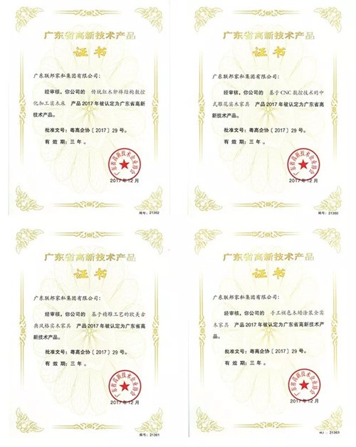 此外,联邦还不断完善以市场为导向的创新体系,推动先进制造和智能制造的落地实施,诞生了水性漆静电喷涂工艺、木材高效节能干燥关键技术等为代表的一大批新工艺、新技术成果。由于持续的研究开发与技术成果转化,联邦四个品项的产品“传统红木榫卯结构数控化加工实木床”、“基于CNC数控技术的中式雕花实木家具”、“基于精雕工艺的欧美古典风格实木家具”、“手工裸色木蜡涂装实木家具”,已顺利通过高新技术产品认定,联邦的技术研发实力和成果转化能力再次得到印证。
