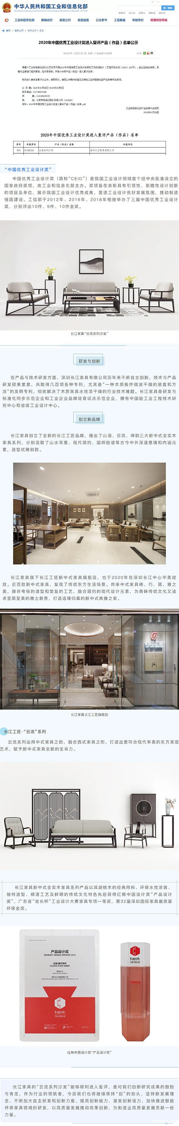 长江家具进入工信部2020年中国优秀工业设计奖复评产品名单