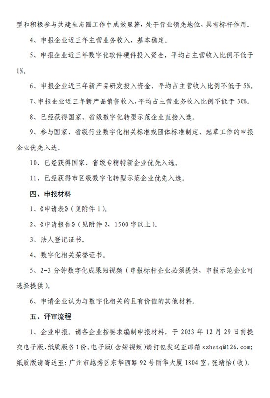 各有关企业: 为全面贯彻落实省工信厅《广东省实施消费品工业“数字三品”行动方案(2022-2025 年)》《广东省家具行业数字化转型指引》精神,根据《广东省家具行业数字化转型工作实施方案》《关于培育广东省家具行业数字化转型标杆、示范企业和服务示范平台等遴选办法》工作要求,广东省家具行业数字化转型工作领导小组(简称:领导小组)组织开展第一批数字化转型标杆、示范企业遴选培育工作,以推动传统家具企业提质、降本、增效、绿色、安全发展。现将有关事项通知如下: 一、申报主体 十九大以来,在我省家具行业数字化转型和共建生态圈工作中成效显著,表现突出的家具生产、家具销售、家具设计、原辅材料生产、智能家具设备企业。 二、基本原则 1、坚持自愿申报、免费参加原则。 2、坚持公平、公正、公开,综合评定、择优遴选原则。 3、广东省家具行业数字化转型工作小组(简称:工作小组)必要时将对申报单位现场考察。 三、申报条件 (一)培育数字化示范企业基本条件 1、申报企业在广东省内依法设立满3年以上,具有独立法人资格且经营良好。 2、申报企业未被列入“信用中国(广东)”网站严重失信主体名单,在生产经营中无发生重大生产安全事故、环境污染事故和存在严重产品质量等问题。 3、申报企业应组织健全、技术先进、效益优良,在我省家具行业数字化转型和参与共建生态圈工作中取得成效,位于行业前列,具有示范作用。 4、申报企业近三年主营业务收入,基本稳定。 5、申报企业近三年数字化软件硬件投入资金,平均占主营收入比例不低于0.5%。 6、申报企业近三年新产品研发投入资金,平均占主营收入比例不低于3%。 7、申报企业近三年新产品销售收入,平均占主营收入比例不低于20%。 8、已经获得市区级数字化转型示范企业优先入选。 9、参与省级、市区级行业数字化相关团体标准制定、起草工作的申报企业优先入选。 10、已经获得市区级专精特新企业优先入选。 (二)培育数字化标杆企业基本条件 1、申报企业在广东省内依法设立满3年以上,具有独立法人资格且经营良好。 2、申报企业未被列入“信用中国(广东)”网站严重失信主体名单,在生产经营中无发生重大生产安全事故、环境污染事故和存在严重产品质量等问题。 3、申报企业应组织健全、技术先进、效益优良,在我省家具行业数字化转型和积极参与共建生态圈工作中成效显著,处于行业领先地位,具有标杆作用。 4、申报企业近三年主营业务收入,基本稳定。 5、申报企业近三年数字化软件硬件投入资金,平均占主营收入比例不低于1%。 6、申报企业近三年新产品研发投入资金,平均占主营收入比例不低于5%。 7、申报企业近三年新产品销售收入,平均占主营业务收入比例不低于30%。 8、已经获得国家、省级数字化转型示范企业直接入选。 9、参与国家、省级行业数字化相关标准或团体标准制定、起草工作的申报企业优先入选。 10、已经获得国家、省级专精特新企业优先入选。 11、已经获得市区级数字化转型示范企业优先入选。 四、申报材料 1、《申请表》(见附件1)。 2、《申请报告》(见附件2,1500字以上)。 3、法人登记证书。 4、数字化相关荣誉证书。 5、2-3分钟数字化成果短视频(申报标杆企业必须提供,申报示范企业可选择提供)。 6、申请企业认为与数字化相关的且有价值的其他材料。 五、评审流程 1、企业申报。请各企业按要求编制申报材料,于2023年12月29日前提交电子版、纸质版各1份。电子版(含短视频)请打包发送至邮箱szhstq@126.com;纸质版请寄送至:广州市越秀区东华西路92号丽华大厦1804室,张靖怡(收),13826023020。 2、组织审核。由工作小组负责组织遴选工作,采取书面评审,必要时现场考察等方式进行。提出《初步入选名单》,报领导小组。 3、评审公示。经领导小组审核,在“betway体彩软件”及betway巴塞罗那微信公众号上公示无异议后,报省家具协会审批。 4、发布名单。发布《入选名单》,拟定于2024年3月初举行授牌仪式,有关事宜将另行通知。 六、联系方式:   联系人:张靖怡、王娟容 betway巴塞罗那