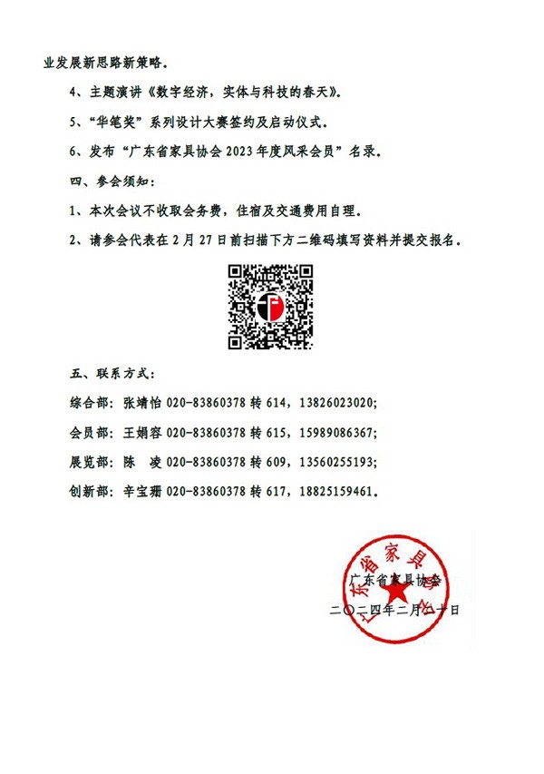 各会员单位: 数字赋能,推动广东家具产业形成新质生产力和行业高质量发展! 为深入学习贯彻落实中央经济工作会议、全省高质量发展大会精神,助力我省家具行业加快形成新质生产力,在高质量发展征程中释放新动能、实现新跨越、回应新期待。经会长会议研究决定,于2024年3月1日(星期五)在广州召开“betway巴塞罗那第七届四次会员代表大会暨第二十届广东省家具行业经济工作会议”。具体通知如下: 一、地点: 广州市长隆国际会展中心一楼CD区(番禺区,番禺大道长隆度假区内)。 二、时间: 1、2024年3月1日(星期五)。 2、签到13∶45-14∶15,会议14∶15-17∶30。 三、会议内容: 1、审议第七届理事会《2023年度工作总结和2024年工作计划》、《2023年度财务报告》,第七届监事会《2023年度工作报告》等。 2、审议《第七届理事会调整议案》,颁发增补理事会成员牌匾证书。 3、分析全国、我省家具行业经济运行情况,以高质量发展为导向,提出行业发展新思路新策略。 4、主题演讲《数字经济,实体与科技的春天》。 5、发布“betway巴塞罗那2023年度风采会员”名录。 四、参会须知: 1、本次会议不收取会务费,住宿及交通费用自理。 2、请参会代表在2月27日前扫描下方二维码填写资料并提交报名。
