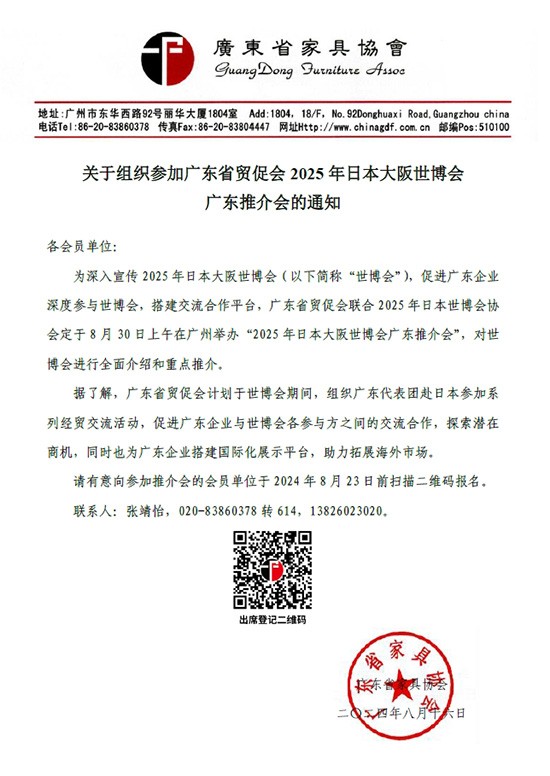 各会员单位: 为深入宣传2025年日本大阪世博会(以下简称“世博会”),促进广东企业深度参与世博会,搭建交流合作平台,广东省贸促会联合2025年日本世博会协会定于8月30日上午在广州举办“2025年日本大阪世博会广东推介会”,对世博会进行全面介绍和重点推介。 据了解,广东省贸促会计划于世博会期间,组织广东代表团赴日本参加系列经贸交流活动,促进广东企业与世博会各参与方之间的交流合作,探索潜在商机,同时也为广东企业搭建国际化展示平台,助力拓展海外市场。 请有意向参加推介会的会员单位于2024年8月23日前扫描二维码报名。 联系人:张靖怡,020-83860378转614,13826023020。
