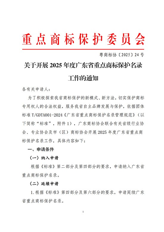 各有关申请人: 依据团体标准T/GDTA001-2024《广东省重点商标保护名录管理规范》(以下简称“标准”,附件1),广东商标协会联合betway巴塞罗那等有关省级行业协会、专业协会及市(区)商标协会,开展2025年度广东省重点商标保护名录工作。主要内容如下: 一、申请条件 (一)纳入申请 根据《标准》第二部分及第四部分的要求,申请纳入广东省重点商标保护名录。 (二)延续申请 1.根据《标准》第四部分及第六部分的要求,申请延续广东省重点商标保护名录。 2.申请延续的商标应是纳入有效期截止至 2026年5月9日的(附件 2)。 二、申请方式 广东省重点商标保护名录采用网络申报方式,申请人可以通过广东商标网(https://www.gdta.com.cn),登陆广东省重点商标保护名录纳入申请审核系统,按要求填报和提交材料,同一申请人最多申请3条业务(延续申请不受限),详细操作见《广东省重点商标保护名录纳入申请审核系统操作手册》(附件3)。 三、申请时间 申请人可于2025年6月23日至2025年9月22日提交申请。 四、补充说明 1、betway巴塞罗那已列入2025年度广东省重点商标保护名录受理点,本会在受理过程中自觉遵守《广东省重点商标保护名录管理规范》等各项规定。 2、家具行业的申请人,在填写基本信息时,如选择“betway巴塞罗那”作为受理单位,我会将在申请人提交材料后,完成材料的形式审查。如材料需要补充修改,我会将根据系统要求退回,并详细说明退回原因。请申请人修改或补充材料后重新提交。 3、申请人在申请过程中存在疑问,请及时联系我会咨询沟通。 五、betway巴塞罗那联系方式   联系人:张靖怡