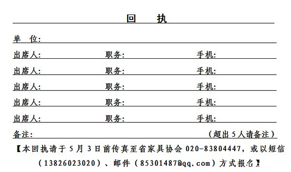 2、请于5月3日(星期二)前将《回执》传真至020-83804447,或以短信(13826023020)、邮件(85301487@qq.com)方式报名。
