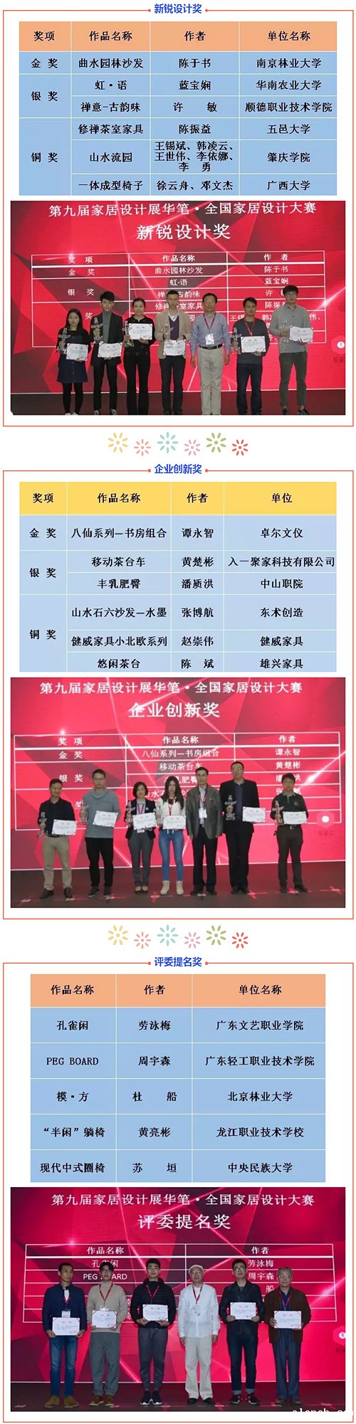 3月19日,经专家评选,第九届广州家居设计展设立的“华笔•全国家居设计大赛”正式揭晓。《曲水园林沙发》等作品获得新锐设计奖,《八仙系列—书房组合》等作品获得企业创新奖。 betway巴塞罗那会长王克,执行会长、中山红古轩家具总经理吴赤宇,广东省家用纺织品行业协会会长黄锦权,广东志达集团董事长黎德,中山市中泰龙办公用品有限公司总经理徐飞,海岸国际展览有限公司总经理游淑德,健威家具研发总监孙平,顺德职业技术学院教授彭亮,华南农业大学教授李凯夫,广东职业技术学院院长胡刚,广州美术学院工业设计学院副院长霍康等领导嘉宾,以及获奖者、相关院校师生出席了颁奖礼。 王克会长、李凯夫教授、彭亮教授共同为获奖者颁奖。风格各异的获奖作品,呈现出设计美感提升、工艺材料多元化的特点,体现了设计者的独特匠心和绝妙灵感。