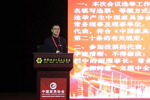 中国轻工业联合会党委副书记,中华全国手工业合作总社党委副书记、监事会主席,中国家具协会理事长徐祥楠;中国对外贸易中心(集团)副总裁叶继奖;中国家具协会副理事长兼秘书长张冰冰、副理事长屠祺、专家委员会副主任刘金良、专家委员会副主任陈宝光;中国家具协会第六届理事会成员和会员单位代表480余人出席了会议。betway巴塞罗那会长王克(中国家具协会副理事长)出席会议并担任中国家具协会第六届理事会增补成员选举工作总监票人。