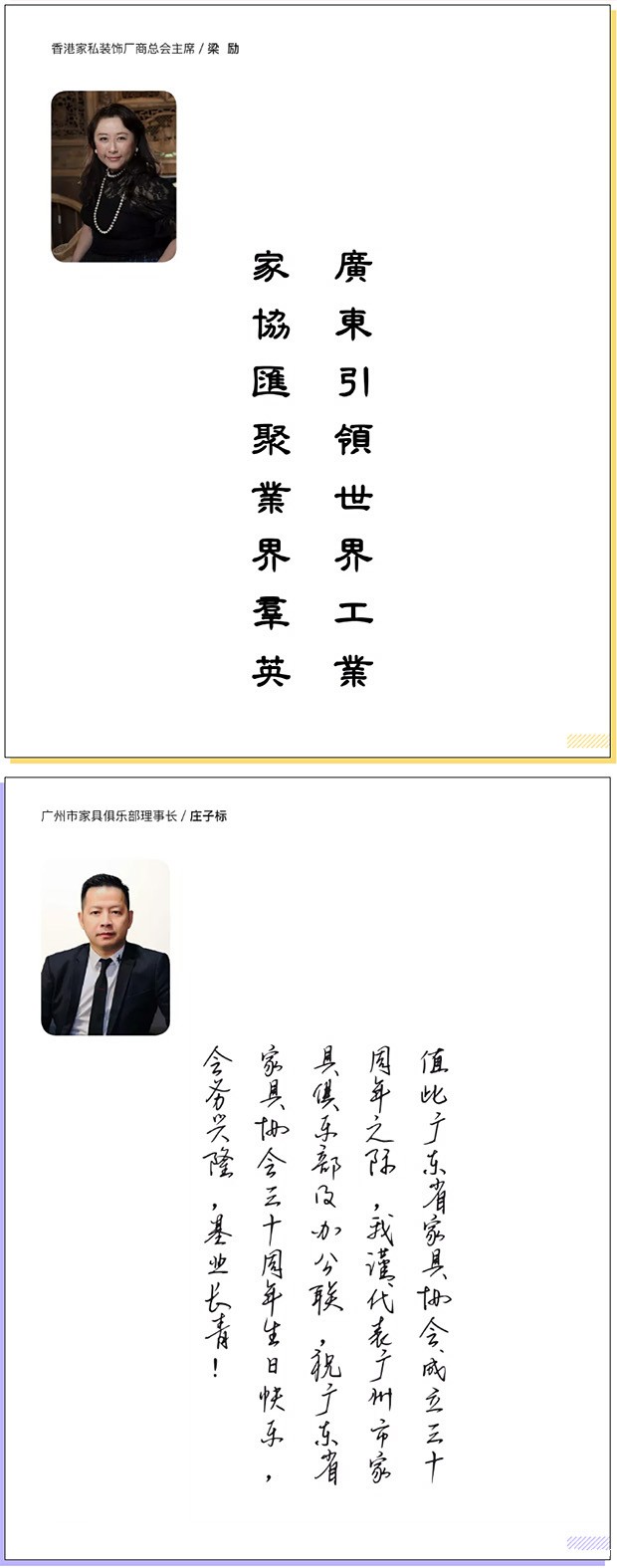 编者按:三十载初心不改,立潮头再创辉煌。广东家协三十年的风雨历程,充分证明行业协会的发展,与国家政策和行业兴衰息息相关,与理事会和秘书处的团结奋进息息相关,与合作单位和友好协会的精诚合作息息相关。我们将继续践行“为行业、会员、政府服务”的宗旨,坦然面对前进中的困难和障碍,做到初心不改、勇立潮头,科学谋划、高歌前行,积极引导行业企业走高质量发展之路,为推动我国向家具强国迈进作出新的更大的贡献! 2021年,在betway巴塞罗那成立三十周之际,香港家私装饰厂商总会主席梁励、广州市家具俱乐部理事长庄子标发来贺词表示祝贺。