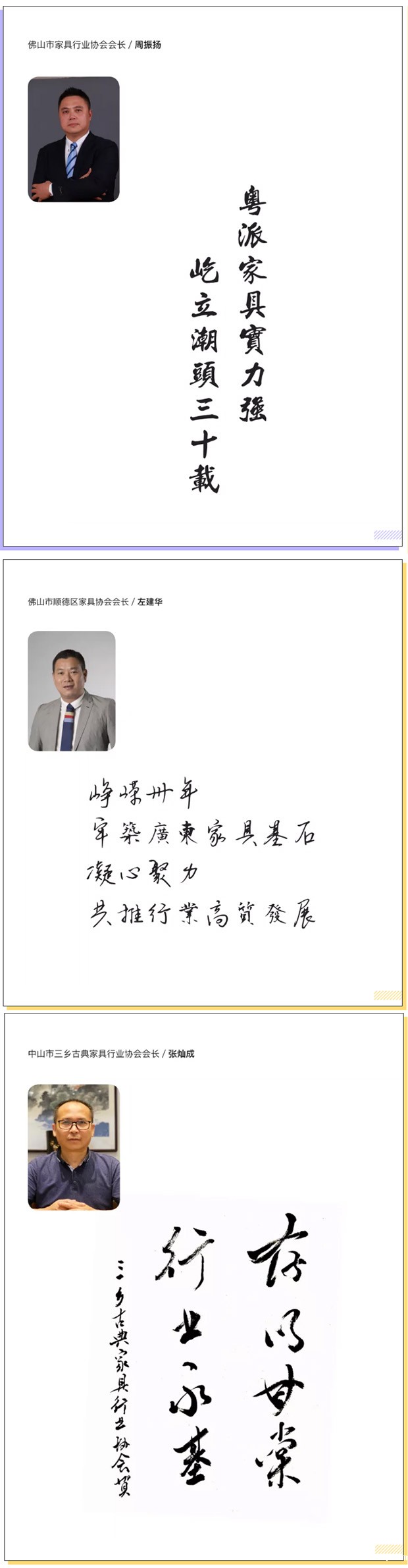 编者按:三十载初心不改,立潮头再创辉煌。广东家协三十年的风雨历程,充分证明行业协会的发展,与国家政策和行业兴衰息息相关,与理事会和秘书处的团结奋进息息相关,与合作单位和友好协会的精诚合作息息相关。我们将继续践行“为行业、会员、政府服务”的宗旨,坦然面对前进中的困难和障碍,做到初心不改、勇立潮头,科学谋划、高歌前行,积极引导行业企业走高质量发展之路,为推动我国向家具强国迈进作出新的更大的贡献! 2021年,在betway巴塞罗那成立三十周之际,佛山市家具行业协会会长周振扬、佛山市顺德区家具协会会长左建华、中山市三乡古典家具行业协会会长张灿成纷纷发来贺词表示祝贺。
