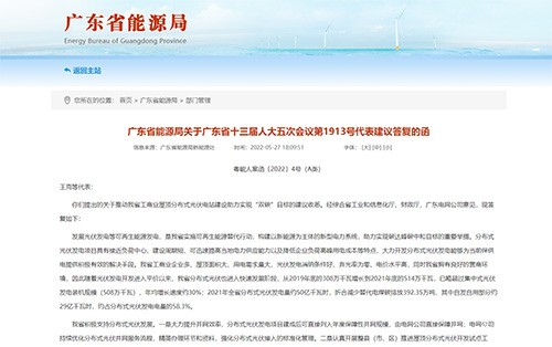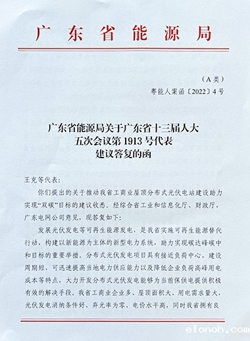 近日,经过专题座谈会、沟通交流,省发展和改革委员会能源局经综合省工信厅、省财政厅、广东电网意见,就王克等代表提出关于推进我省工商业分布式光伏电站建设,助力实现“双碳”目标的建议给予书面答复。对《建议》内容表示认可和赞同,对我省能源发展工作的关心支持表示感谢。