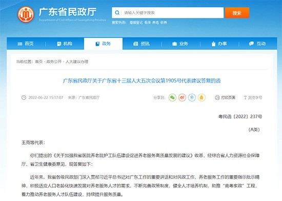 《答复函》表示,近年来,我省各级民政部门深入贯彻习近平总书记对广东工作的重要讲话和对民政工作、养老服务工作的重要指示批示精神,积极适应人口老龄化快速发展对养老服务人才的需求,不断完善政策制度,健全人才培养机制,助推“南粤家政”工程,着力推动养老服务人才队伍建设,持续提升服务质量。主要体现在:完善养老服务人才队伍建设政策体系,促进养老服务人才队伍高质量发展,健全医养结合保障机制,强化养老服务综合监管等方面。 《答复函》指出,下一步我们将认真听取人大代表的建议,加强与省直各有关部门密切协作,助推“南粤家政”工程,不断健全养老服务人员培训体系,强化养老服务人才队伍建设,推进多层次养老服务人才培养,实现养老护理服务从业人员职业素质和工作质量整体提升;聚焦老年人医养康养服务需求,完善各项扶持政策,优化医养结合机制,不断加强养老服务综合监管,进一步促进我省养老服务体系日益完善。