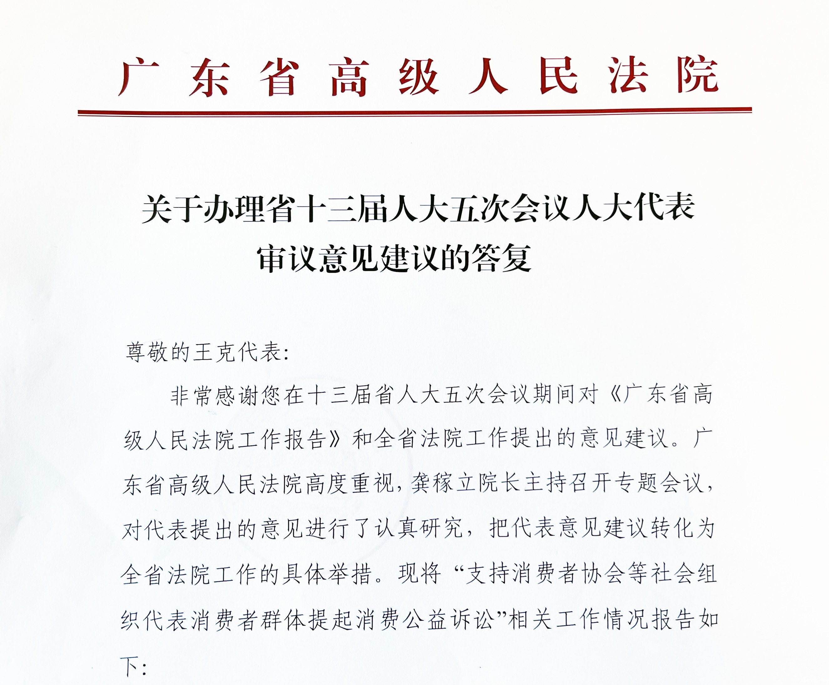 近日,广东省高级人民法院向王克代表发来书面《关于办理省十三届人大五次会议人大代表审议意见建议的答复》表示,非常感谢您在省十三届人大五次会议期间,对《省高级人民法院工作报告》和全省法院工作提出“支持消费者协会等社会组织代表消费者群体提出消费公益诉讼”的意见建议。省高级人民法院高度重视,龚稼立院长主持召开专题会议,对代表提出的意见进行了认真研究,把代表的意见建议转化为全省法院工作的具体举措。
