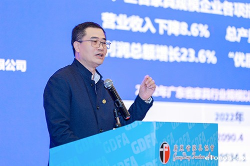 会议得到了省工业和信息化厅、省商务厅、省林业局的热情指导,佛山市悍高家具制品有限公司、中山市顺泽脚轮有限公司、广东省聚智家居创新中心的协办。省工信厅消费品工业处三级调研员许建成、生产服务业与交流合作处四级调研员代红兵,省商务厅商务交流处三级调研员许霓,省林业局改革和产业发展处处长、一级调研员林东红,省社会组织党委委员、省家具协会会长王克,韶关市林业局局长丘德周,佛山南海区九江镇镇长罗淮东、副镇长周子健,省家具协会执行会长:杜泽桦、江学院、姚永红、廖顺南、陈桂芳、何广经、吴赤宇、任作辉、李礼,东莞市家具协会会长袁世豪,中山市家具商会会长李剑文,中山市红木协会会长林志洪,新会传统古典家具行业协会常务副会长蒋华侨,省家具协会监事长高英华,暨南大学广东外贸服务研究中心主任苏启林教授等出席。来自全省家具行业的骨干企业代表和嘉宾约300人参加了会议。省家具协会执行会长兼秘书长张承志主持会议。 会上,王克会长在题为《制造业当家,凝心聚力推动我省家具行业高质量发展新的跨越》的报告中分析了2022年我省家具行业运行特点。2022年,我省家具行业坚持“创新驱动、设计引领、优质优价、绿色发展”指导思想,努力克服疫情对国内外经济产生的负面影响,全面实施“增品种、提品质、创品牌”战略,整体经济运行稳中向好,呈现出行业发展新特征、国际贸易新变化、家具消费新趋势、品牌建设新成效、产业集群新动向、会展经济新形势、工业设计新成果、产业投资新动能等特点。
