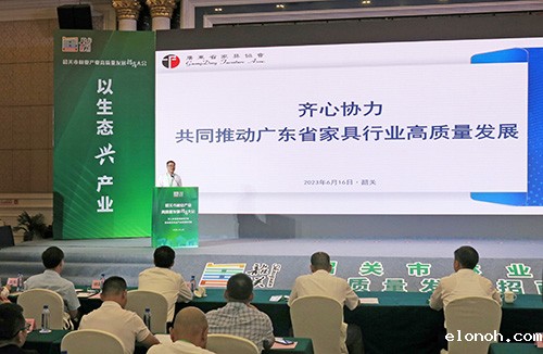 王会长认为,现代竹产业作为“产业兴、百姓富、生态优”的绿色环保产业,推广“以竹代塑”“以竹代木”“以竹代钢”大有可为,不仅利于解决森林资源循环再生问题,又促进竹农增收致富、解决就业,形成绿色富民产业,促进绿水青山变成金山银山。对此,我们要坚持发挥区域优势、科技先导、质量优先、多元投入、市场导向的原则,实现科学规划、重点种植、有序砍伐、有效应用、提高效益。同时,鼓励更多的家具企业在原竹家具、竹集成材家具下功夫,通过工业设计满足家具“时尚化、艺术化、功能化、绿色化”的发展趋势,不断提升产品附加值,为实现我省“双碳”目标做出积极贡献。我们要引导珠三角企业参与向粤东西北地区产业有序转移,促进产业链、供应链融合发展,团结带领家具企业走集约型、数字型、生态型、效益型的健康发展之路,凝心聚力推动广东省家具行业高质量发展新的跨越! 在宣传推介环节,韶关市林业局、各县(市、区)领导以及韶关林业企业代表详细介绍韶关林业产业优势、发展方向、绿美生态建设和投资环境。