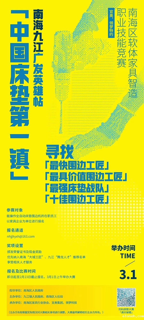宜奥人力资源总监熊荣华介绍:宜奥、领梦特约南海区软体家具智造职业技能竞赛,即日起至2月23日接受报名。赛事围绕床垫制造中的一道关键工序“围边”,进行自动化数字化围边机操作大比武,广邀家具企业组建3人或以上团队参赛,角逐最快围边工匠、最具价值围边工匠、十佳围边工匠、最强床垫战队等奖项。个人奖最高获3000元奖励,团队奖最高获5000元奖励。决赛将于3月1日在南海九江宜奥数字化车间举行。
