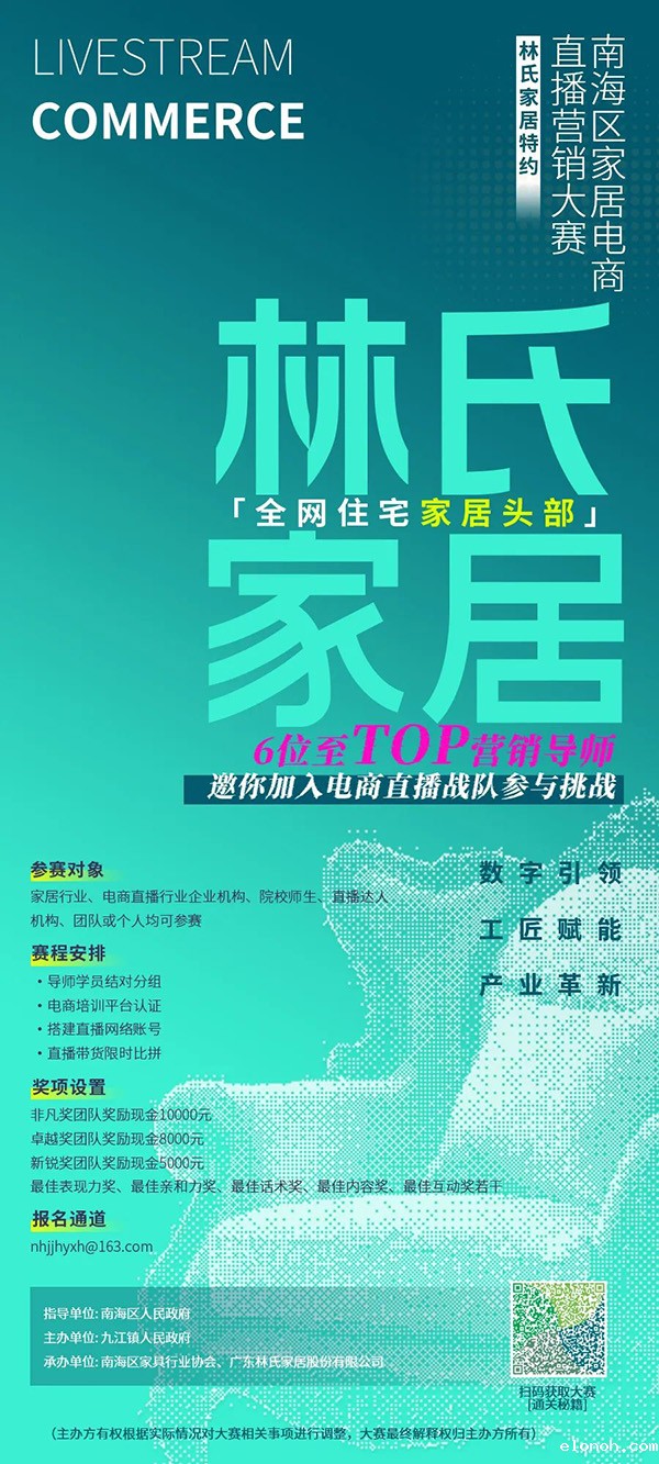 林氏家居新媒体事业部培训总监赵简介绍:林氏家居特约南海区家居电商直播营销大赛将以全网头部流量造星,唱响南海家具好声音,为南海智造添砖加瓦;赛事将历时3个月,共设5轮关卡,由导师带队打团战,六团PK角逐奖项,战队成绩以直播渠道销售总额为重要评分依据。赛事设非凡奖团队奖金10000元、卓越奖团队奖金8000元、新锐奖团队奖金5000元以及最佳表现力奖、最佳亲和力奖、最佳话术奖、最佳内容奖、最佳互动奖若干。赛事将为获奖选手或团队提供企业入职机会。