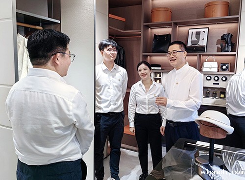 7月8日,第27届中国建博会(广州)在广交会展馆盛大开幕。展会首日,betway巴塞罗那会长王克、执行会长兼秘书长张承志在参加第三届中国商用空间创新设计大奖颁奖典礼后,前往协会副会长单位励致家私、海太欧林集团、东泰五金,理事单位沃高家具,以及宏信艾比等企业展位,详细了解产品创新、市场销售情况,鼓励企业树立信心,坚持内外并举的“两条腿”发展策略,积极开拓多元化市场,加大研发创新投入,推动设计、品质、服务、品牌升级。 本届展会以“冠军企业首秀平台”为定位,强化商业转化功能,汇聚近2000家参展企业,吸引逾20万海内外专业观众到会,集中展示了行业前沿技术、创新成果与未来发展趋势。 广东家协展览及会员服务部经理王娟容、媒体部经理陈志荣、创新综合部副经理辛宝珊参加走访调研。