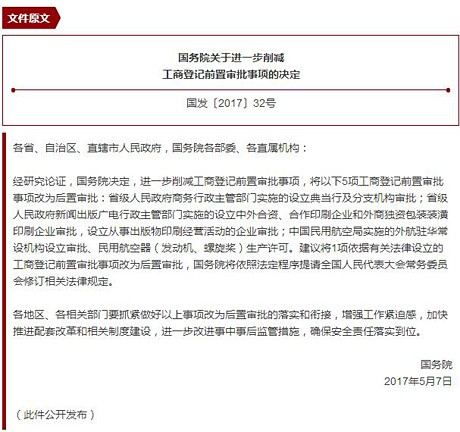 国务院印发《关于进一步削减工商登记前置审批事项的决定》 2017-5-12   来源:中国政府网