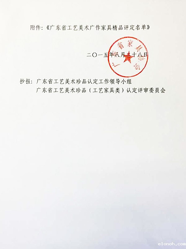 |           ____________________________________________________________________________________________________________________________________________________________________                 关于公布广东省工艺美术广作家具精品评定名单的通知 粤家协﹝2015﹞16号   各市红木、古典家具协会,相关单位、人员:           为促进“广作家具”传统文化的传承与发展,在省经济和信息化委员会的指导下,在省家具协会、省工艺美术珍品(工艺家具类)认定工作领导小组领导下,广东省工艺美术珍品(工艺家具类)认定评审委员会受省家具协会委托,根据《广作家具精品评定评价要点》、《广东省工艺美术珍品家具/广作精品认定评审议程》的要求,坚持“公平、公正、公开、科学、有序”原则,顺利完成“广作家具?精品”的评定工作,评定结果上报领导小组会议研究后,把《广作家具精品评定名单》(公示稿)进行七天网上公示,公示期间无任何异议。现将《广东省工艺美术广作家具精品评定名单》公布如下(见附件)。           对此,向获得广作精品评定的企业/个人表示祝贺,望戒骄戒躁、再接再厉、多出精品、打造珍品,积极参与相关的作品展览、出版《作品图录》等宣传推广工作,为推动我省红木家具文化传承和发展做出更大的贡献!           附件:《广东省工艺美术广作家具精品评定名单》     二〇一五年八月二十八日